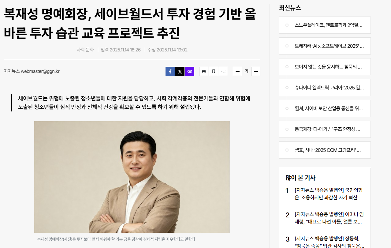 | [희망편지] "당신의 겨울이 유독 춥고 시리지 않도록..." 벼랑 끝에 선 당신에게 띄우는 복재성 명예회장의 약속 (0) | 2025.12.08 |